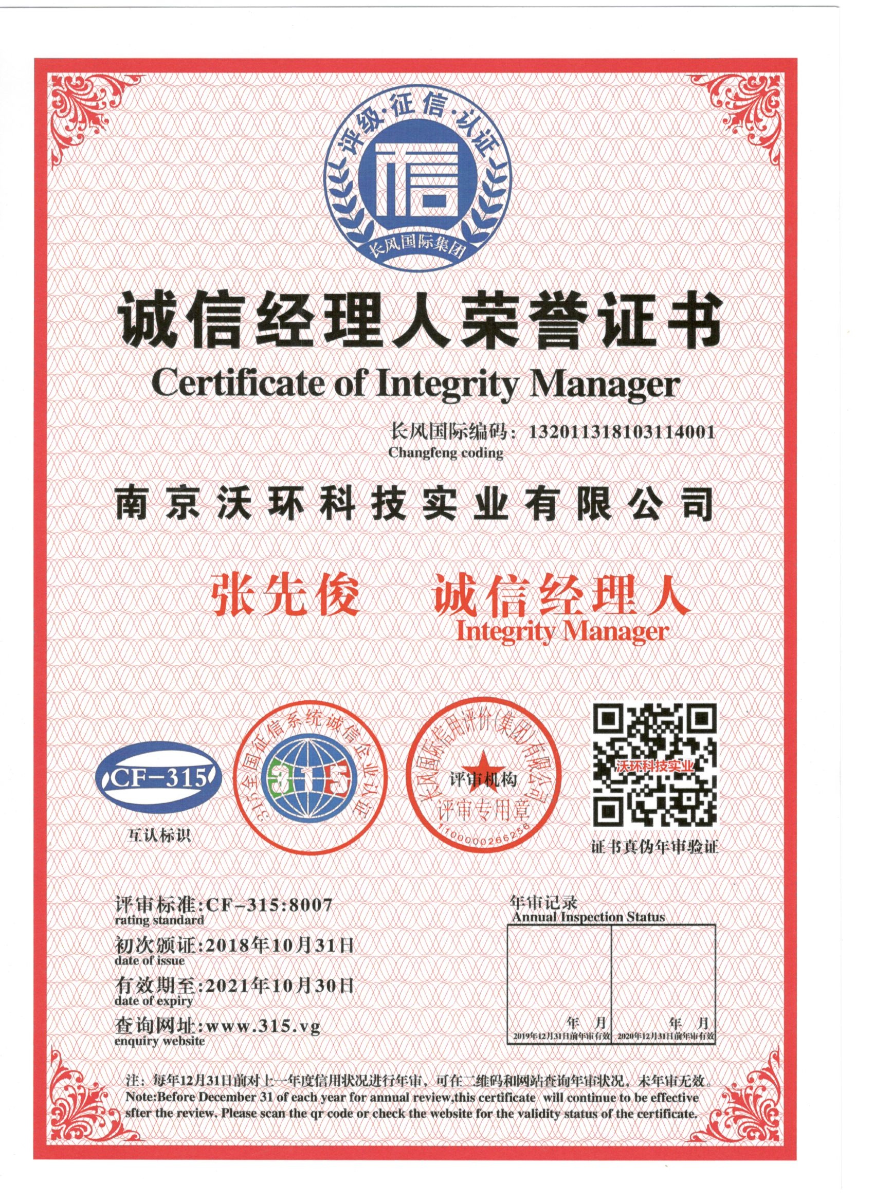 熱烈祝賀南京沃環(huán)公司張先俊先生被專(zhuān)業(yè)評(píng)審機(jī)構(gòu)-長(zhǎng)風(fēng)國(guó)際集團(tuán)評(píng)為誠(chéng)信經(jīng)理人,特發(fā)此證書(shū)