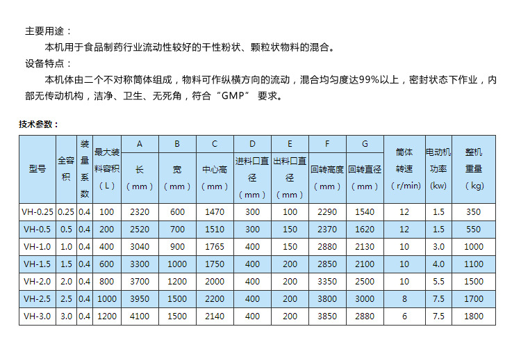 本機適用于制藥、化工、食品的干粉狀、顆粒裝物料的混合。該機混料筒結構獨特,混合均勻,效率高,不積料。整機結構簡單,操作容易。外表面和物料接觸部分均采用優(yōu)質不銹鋼制造,造型美觀,維護、清洗方便。